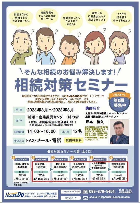 ごきげんよう ハウスドゥ!サンパーク通り浦添店 内間です♪ 好評につき、開催決定いたしました❕❕ 第8期生⭐無料⭐相続対策...